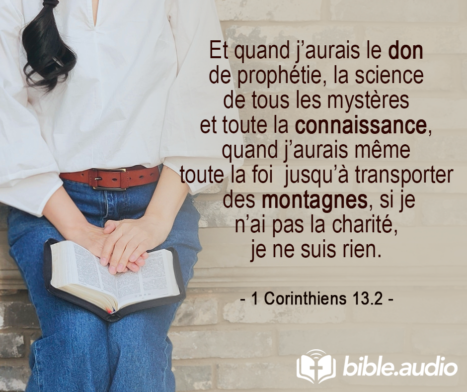 Et quand j’aurais le don de prophétie, la science de tous les mystères et toute la connaissance, quand j’aurais même toute la foi jusqu’à transporter des montagnes, si je n’ai pas la charité, je ne suis rien.